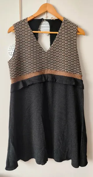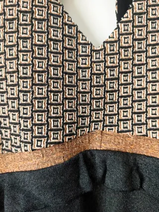 Vestido sin mangas de la marca NKN Nekane. Presenta un diseño con estampado geométrico en la parte superior y una falda lisa. - Escote en pico. - Detalle de banda en color cobre. - Abertura en la espalda.