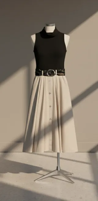 Vestido elegante de dos piezas, con un diseño moderno y sofisticado. - Parte superior de cuello alto sin mangas. - Falda larga con botones frontales. - Cinturón a juego con hebilla redonda. - Cierre lateral con cremallera oculta en costura.