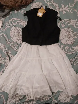 Conjunto de vestido con top tipo chaleco y falda. - Top negro sin mangas. - Falda blanca con volantes.