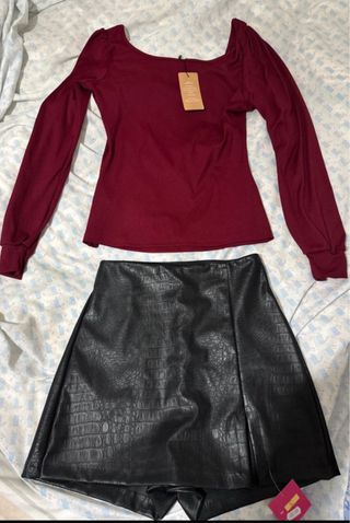Conjunto de falda y camisa. - Falda negra. local - Top de manga larga color vino. shein