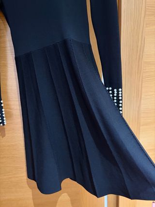 Elegante vestido de manga larga con detalles de perlas. - Cuello alto adornado con perlas. - Puños de las mangas con detalle de perlas. - Falda con plisado vertical.