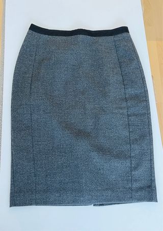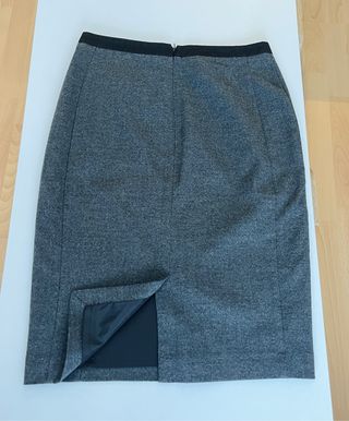 Elegante falda de tubo con tejido tweed en color gris. Presenta un diseño clásico y versátil. - Cintura con detalle negro. - Abertura en la parte trasera. - Forro interior.
