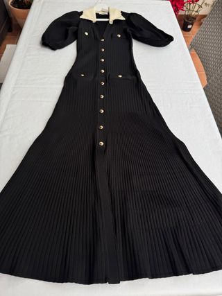 Vestido negro de punto con detalles. - Escote adornado con tejido plateado y botones. - Mangas largas con detalles de botones en los puños. - Falda acampanada con canalé. Modelo único, se le añadió la parte plateada para reducir el escote Talla S(38)