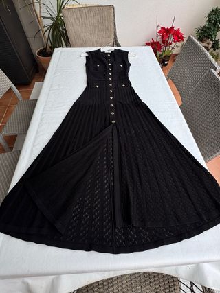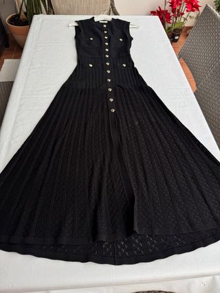Elegante vestido largo de punto negro de la marca Sandro. - Diseño sin mangas. - Cierre de botones dorados en la parte delantera. - Bolsillos de parche en el pecho. - Falda con vuelo y detalles de canalé y calados.