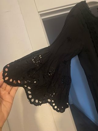 Precioso vestido negro de algodón. Es de manga tres cuartos y tiene un diseño de encaje precioso. - Escote redondo. - Corte a la cintura. - Falda acampanada.