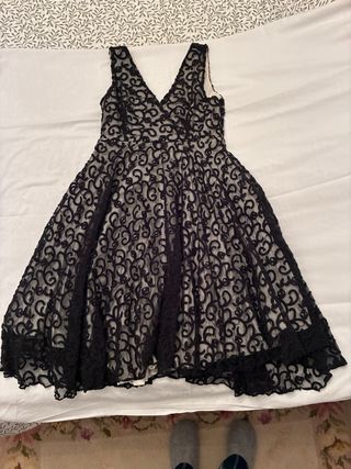 Elegante vestido de cóctel con un intrincado diseño de encaje. - Escote en V. - Diseño sin mangas. - Falda con vuelo. - Detalle de encaje en el bajo.