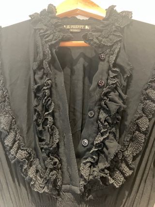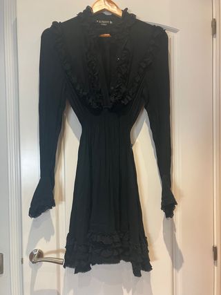 Elegante vestido negro de la marca Highly Preppy, con un diseño detallado y femenino. Talla Xs que vale para X. - Mangas largas con encaje en los puños. - Cuello alto con volantes. - Adorno de volantes en el escote y la falda. - Cintura ajustada con fruncido. - Falda con capas de volantes. Lleva combinación negra independiente para no transparentar.