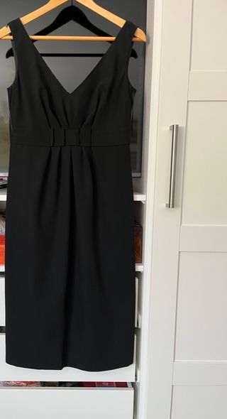 Elegante vestido negro de la marca Laurel., tejido Lana - Diseño sin mangas. - Escote en pico. - Detalle de lazo en la cintura. - Falda con pliegues.