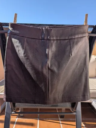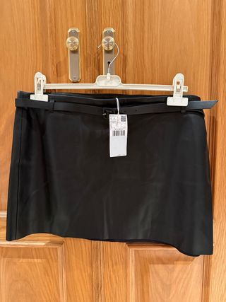 Minifalda de efecto piel con un diseño moderno y versátil. Talla M de mango con su etiqueta, sin estrenar - Cierre de cremallera. - Bolsillos delanteros con cremallera. - Trabillas para cinturón.