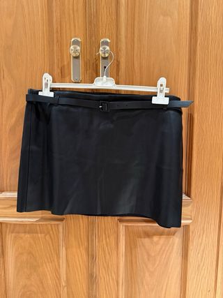Minifalda con cinturón de efecto piel. Largo: 36 cm Ancho: 45 cm - Diseño liso. - Cinturón con hebilla. - Cierre con cremallera oculta en la parte posterior. -Tiene forro dentro.