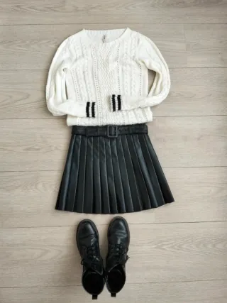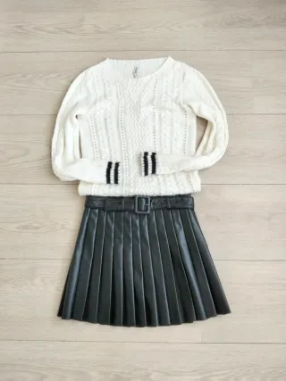 Conjunto de falda y jersey. - Jersey de punto trenzado blanco con detalles en las mangas. Talla S pequeño, más bien XS. - Falda negra plisada de efecto piel. Talla como una XS, aunque sea 32. Con cinturón.
