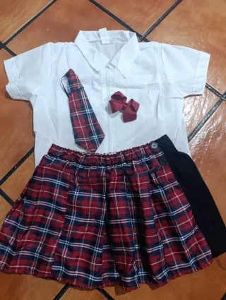 Conjunto de disfraz de colegiala con falda de cuadros tartán y accesorios. - Camisa blanca de manga corta. - Falda plisada con estampado tartán. - Corbata a juego. - Lazo de pelo rojo.