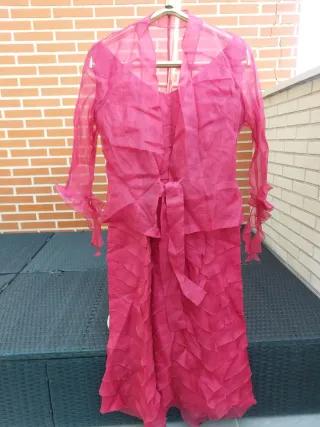 Elegante conjunto de dos piezas, ideal para eventos especiales. La tela es ligera y con un bonito drapeado. - Chaqueta con mangas acampanadas. - Vestido con cinturón a juego. - Diseño con volantes en la falda.