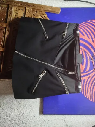 Mini falda con múltiples cremalleras decorativas. - Diseño moderno y atrevido. - Detalle de cremalleras plateadas. - Corte mini,tejido grueso y elastico