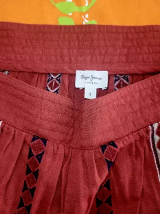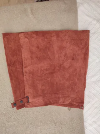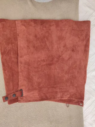 Falda de ante en color teja talla XL. Tiene un diseño moderno y es muy cómoda. Está como nueva - Cierre con botones a presión y hebilla.
