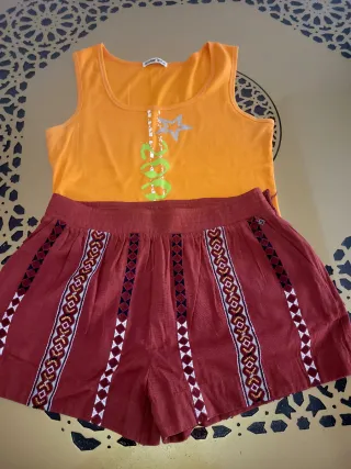 Conjunto de ropa de verano compuesto por un top sin mangas y una falda corta. - Top de color naranja con estampado frontal. - Falda de color rojo con detalles bordados. - Diseño con motivos geométricos en la falda.