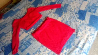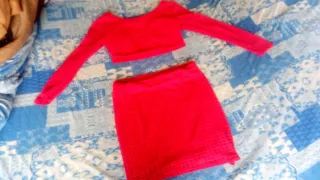 Conjunto de dos piezas en color rojo, ideal para un look moderno. - Crop top de manga larga. - Falda de tejido texturizado.