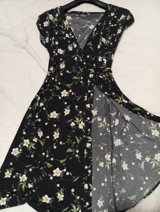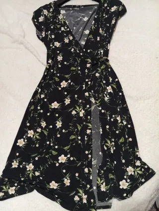 Vestido alegre con estampado floral. - Diseño cruzado. - Manga corta. - Falda con abertura.