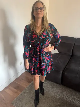 Vestido midi con estampado floral vibrante. Presenta un escote en V cruzado y mangas largas abullonadas. - Diseño cruzado. - Mangas largas abullonadas. - Largo midi. Vestido largo (Maxi) con un estampado floral vibrante y moderno en tonos azules y naranja. La tela es fluida, y el diseño de manga abullonada lo hace ideal para eventos, bodas o un look elegante de primavera/verano. Tiene un corte que marca la cintura y una abertura en la falda para facilitar el movimiento. Talla L. Largo total de 138 cm. ¡Nuevo con etiquetas!"