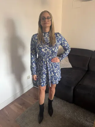 Vestido corto de Zara con un llamativo estampado paisley. - Diseño con cuello redondo y manga larga abullonada. - Detalle de fruncido y volantes en la falda. - Tejido ligero y fluido.