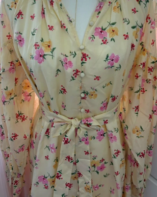 Vestido de manga larga con estampado floral sobre fondo amarillo. Presenta un cuello con volantes y cierre de botones. - Cinturón de tela a juego. - Puños abullonados. - Falda con volantes.