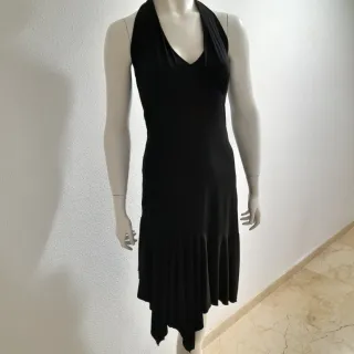 Elegante vestido negro con escote halter y un diseño asimétrico en la falda. - Escote halter. - Falda con volantes y corte asimétrico. - Tejido suave y fluido. Bonito Vestido sin mangas ideal de Cóctel o fiesta, talla L, marca Dandara. NUEVO SIN ESTRENAR NUNCA SE HA USADO.