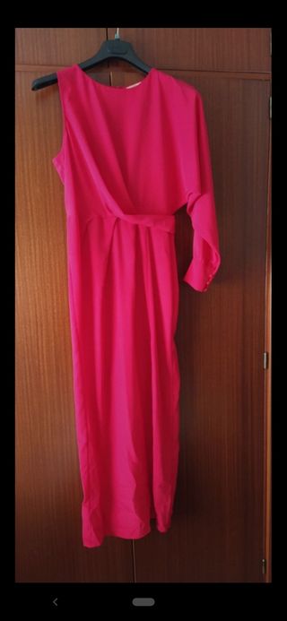 Vestido ideal para invitada, con una sola manga y apertura lateral en la falda. Color coral fuerte con cremallera en la espalda.