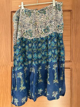 Falda larga con forro en la parte superior y abierta en los laterales. Talla XS