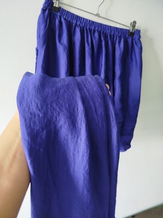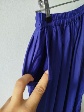 Elegante falda larga de satén con un vibrante color morado. Perfecta para ocasiones especiales o para darle un toque sofisticado a tu día a día. Talla S pero la cintura elástica puede usar para + talla (M o incluso L ) el tirobajo es de cadera no de cintura. - Tejido de satén brillante. - Cintura elástica para mayor comodidad. - Corte maxi fluido.