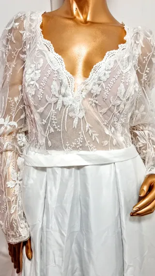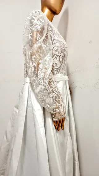 Elegante vestido de novia con detalles de encaje. - Diseño con escote en V. - Mangas largas de encaje. - Cintura marcada con banda de satén. - Falda larga con caída.