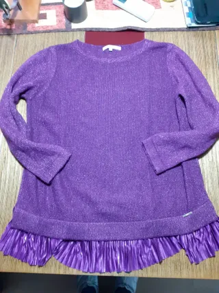 Jersey de punto fino con detalles brillantes y falda plisada. Medidas: hombros 38cm, pecho 53cm, largo 65 cm. - Manga larga. - Cuello redondo. - Bajo con volante plisado.