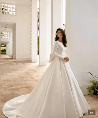 Elegante vestido de novia confeccionado en tela satén. - Diseño con mangas largas. - Detalle de lazo en la espalda. - Corte de falda voluminoso.