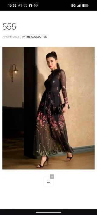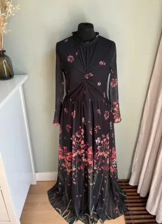 Elegante vestido largo de Ted Baker con un estampado floral sobre fondo negro. Ideal para ocasiones especiales. Talla 2 una S- M - Diseño de manga larga. - Escote alto. - Falda fluida con transparencia.