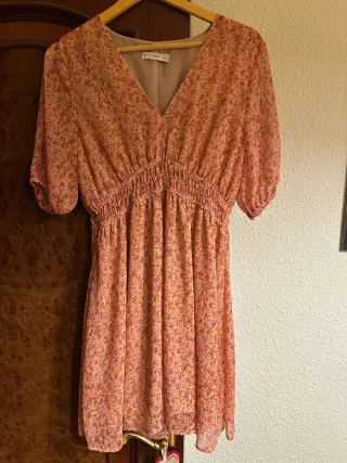 Vestido de verano con estampado floral en tonos naranjas y rosas. Presenta un diseño con escote en V y cintura elástica. - Mangas cortas abullonadas. - Falda con caída. - Tejido ligero y vaporoso.