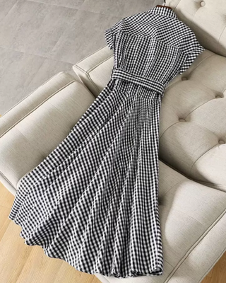 Vestido con estampado de cuadros. - Diseño de manga corta. - Cinturón a juego. - Falda con vuelo.