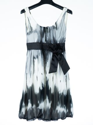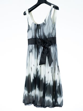 Vestido de tirantes con un llamativo estampado abstracto en blanco y negro. Presenta un cinturón de tela satinada negra anudado en forma de lazo en la cintura. - Diseño sin mangas. - Falda con vuelo y detalle fruncido en el bajo. - Medidas: ancho de tirantes: tirantes 26 cm, axila-axila:34 cm, largo 87 cm