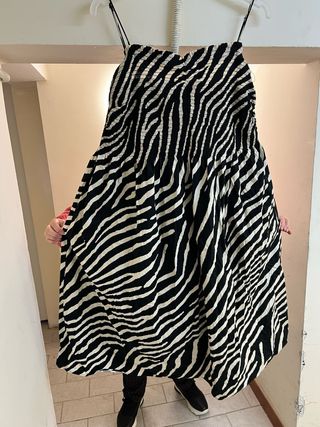 Vestido con un llamativo estampado de cebra. Su diseño lo hace ideal para diversas ocasiones. - Diseño sin mangas con tirantes. - Cuerpo fruncido elástico. - Falda amplia y fluida.