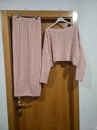 Conjunto de dos piezas de punto en color rosa. Incluye jersey y falda. - Jersey de punto con cuello barco y manga larga. - Falda de punto larga. - Diseño de trenzas en toda la prenda. No se hacen cambios ni devoluciones