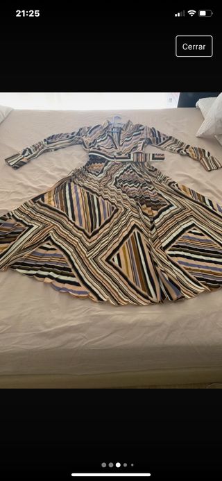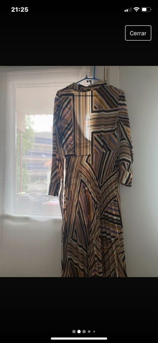 Vestido largo de Zara con un llamativo estampado. - Diseño con mangas largas. - Cintura marcada y falda con vuelo. - Cuello redondo.