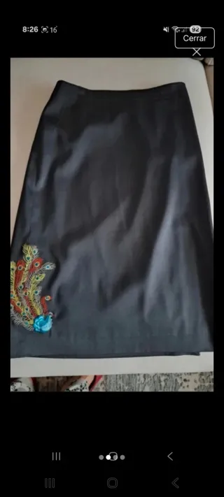Falda elegante de color negro con un detalle bordado de pavo real en un lateral. - Diseño de pavo real con múltiples colores. - Abertura lateral para mayor comodidad.