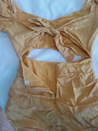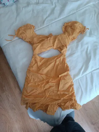 Vestido de color naranja con un diseño moderno y favorecedor. - Escote cruzado. - Abertura en la cintura (cut-out). - Mangas abullonadas con lazada. - Falda con volantes.