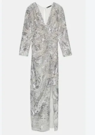 Elegante vestido largo con lentejuelas plateadas y detalle de fruncido. - Diseño con escote en V. - Manga larga. - Abertura lateral en la falda. Es espectacular. Completamente nuevo,a estrenar.