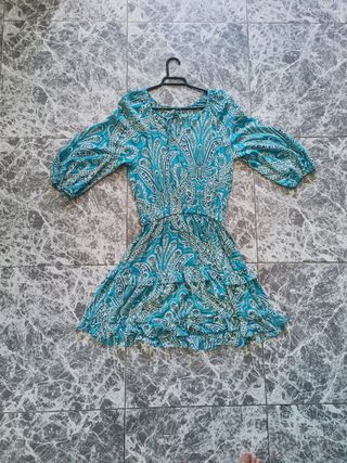 Precioso vestido corto de Zara, ideal para cualquier ocasión. Es de color turquesa y tiene un estampado precioso. - Escote redondo. - Manga tres cuartos. - Detalle fruncido en la cintura. - Falda con vuelo.