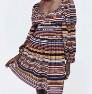 Vestido Zara, estampado de rayas multicolor, escote amplio elastico, mangas abullonadas con elastico en el puño, y falda acampanada. Tejido plisado y elastico. Talla M. Composicion 100% Poliester. Nuevo con etiqueta. Medidas Sisa 40 cm Cintura 35 cm Largo 78 cm