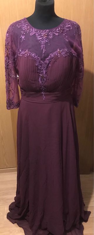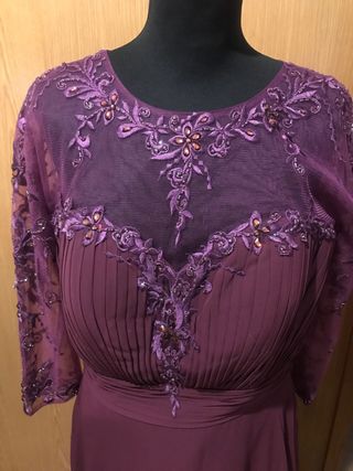 Elegante vestido morado, perfecto para eventos especiales como bodas. - Diseño con detalles de encaje y pedrería en el escote y mangas. - Mangas largas transparentes con adornos. - Cuerpo fruncido con fajín a la cintura. - Falda larga y fluida.