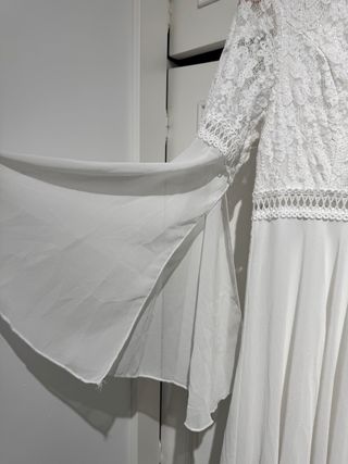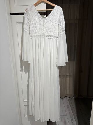 Elegante vestido largo de color blanco, ideal para eventos especiales. Presenta un delicado encaje en la parte superior y mangas acampanadas. Usado una vez. - Diseño con escote en V. - Detalle de encaje en cuerpo y mangas. - Mangas largas acampanadas. - Falda larga y fluida.