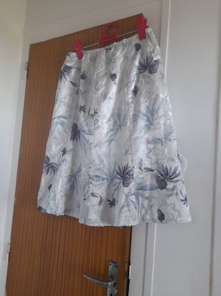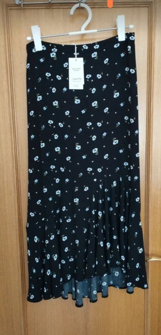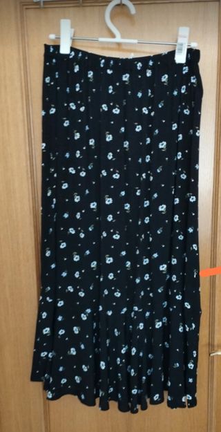Preciosa falda con un estampado floral sobre fondo negro. Detalle de pequeños volantitos. - Diseño con volantes. - Tejido ligero y fluido. - Toda con forro negro.