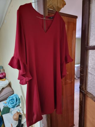 Precioso vestido rojo de manga tres cuartos con detalle de volantes. Es una prenda elegante y cómoda, ideal para cualquier ocasión. - Talla: Mediana - Cierre: Cremallera invisible en la espalda - Tejido: Suave y fluido - Corte: Ajustado a la cintura, ligeramente acampanado en la falda