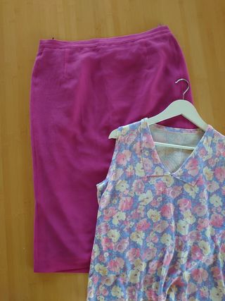 Preciosa falda lápiz rosa y blusa sin mangas con estampado floral. La falda es de un tejido liso y la blusa tiene un corte favorecedor. - Perfecto para ocasiones especiales o para el día a día. - Ideal para primavera/verano. - Talla única (comprueba medidas).