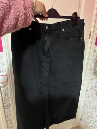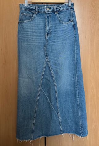 Falda vaquera de corte midi, perfecta para combinar. - Diseño con abertura frontal. - Cintura alta. - Bolsillos delanteros y traseros.